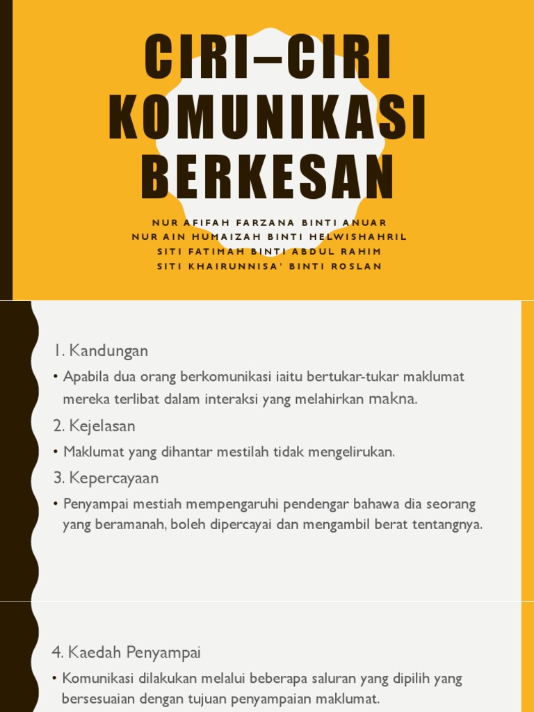 Jelaskan lima daripada ciri-ciri yang menjadi asas. Agar komunikasi yang kita lakukan dapat menimbulkan kesan positif di mata orang lain maka ada beberapa teknik komunikasi berkesan dan teknik komunikasi efektif yang harus kita. KANDUNGAN KURSUS Hari Pertama.